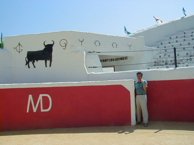 と、シェリー酒を昼間っから浴びている赤ら顔のマネージャーから勇気付けられたものの、やっぱり足がなかなか言うことを利かなくて、体を横にしなければ入り込めないくらい狭い隙間から、おっかなびっくり顔を出す素人ニワカ闘牛士。ようやく決心がついて気張って出場してみたものの、ちょっと牛の機嫌を伺うように出ては挑発するが、怒り狂った牛にじろっと睨まれ、突進され、それでもって仰天してたちまちのうちにこの壁の中へ逃げ込む・・・・5歩は離れることができても、毎日訓練すればいつかはこの防護壁から10歩、離れることが出来るだろうか?
