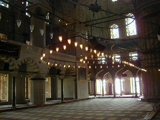 床にはお祈りのため、等身大のカーペットがメッカに向かってきちっと敷き詰められている。これは外観のデザインとマッチする。四角だらけの粗末なデザインとは異なり、ふんだんにR(カーブ)が施されており、見飽きない。天井からは説教を聴くためのスピーカーが吊り下げられている。靴を脱いで寺院に入る方式は日本と同じであり、土足で教会に入るキリスト教文化とは異なる。床にひれ伏す儀式のためにはカーペットが必要だからであろう。