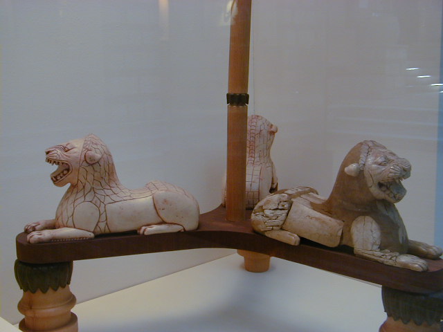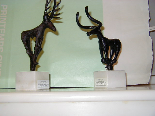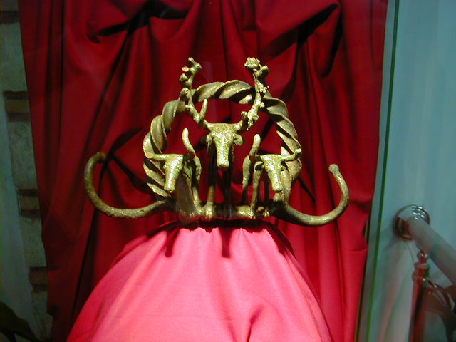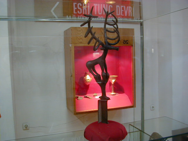 ↓鹿と牛を大切にしていた。家畜は動物性蛋白補給に欠かせない存在。それにしても見事な角。大袈裟だがシンプル。背景にある別のケースに収められた金杯と赤い壁紙が演出してくれる。にくい撮影だなぁ、我ながら。。。^^;