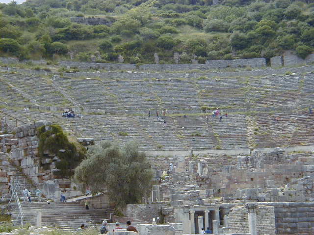 円形劇場の存在価値が大きい。ギリシャのアポロン神殿の上にも円形劇場があり、お参りの後にはそこで観劇を楽しんだ跡が残されている。音響効果が確かめられるため政治的演説会でも利用された。↓?万人収容可能なトルコ西部のエフェソスの円形劇場。