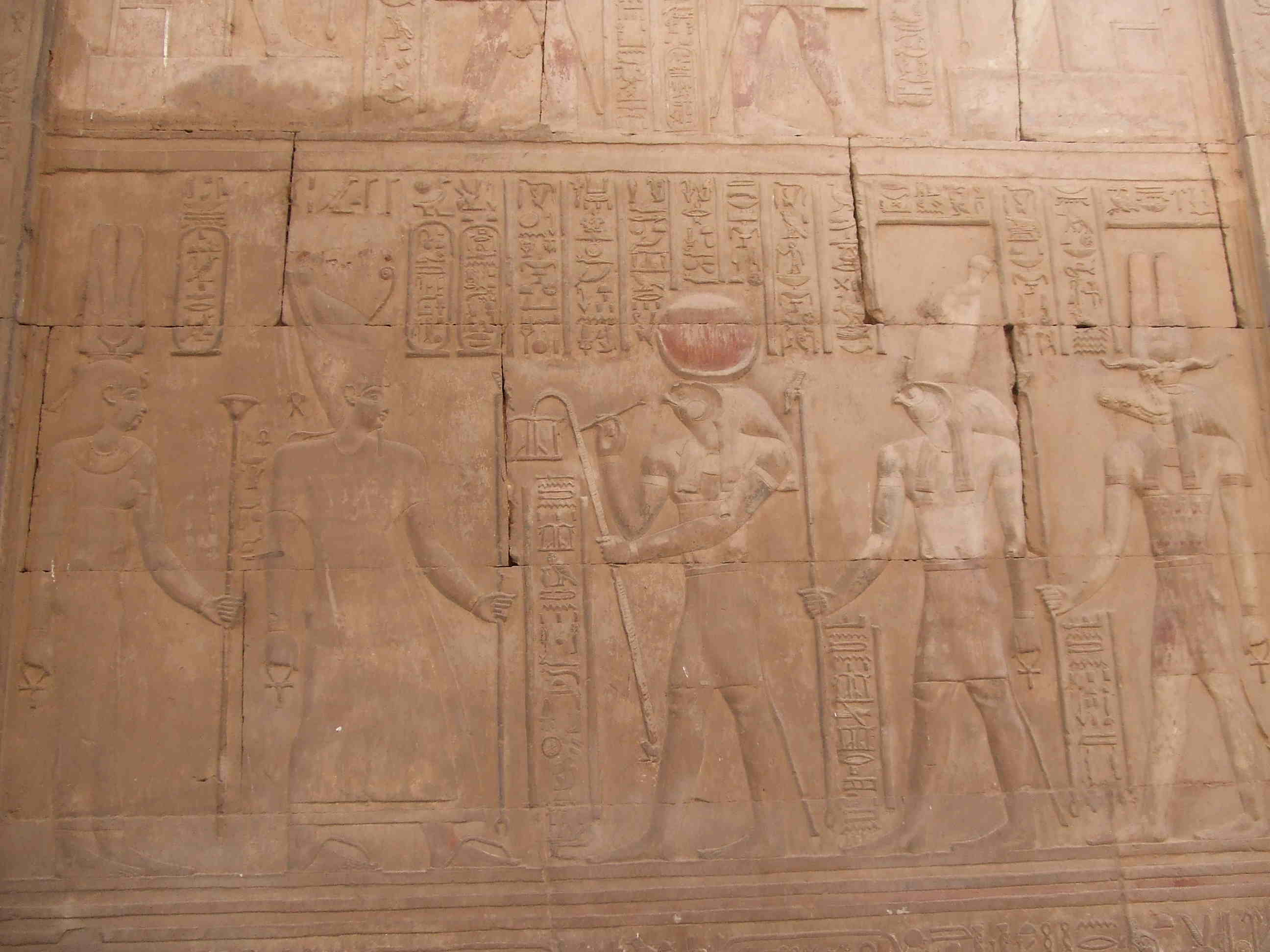 ワニと牛 善と悪を対比させているのは理解できるが、ワニトウシなどいう組み合わせは見たことが無い。西安の博物館には死者を弔う意味でセミを口にくわえさせて豚を手にもたせた埋葬例が陳列されていたがここコムオンボではワニトウシ。強さと豊かさの象徴か?