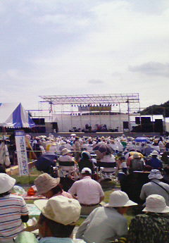なにしろ暑いので、舞台から200メートルぐらい離れた丘の上にある木陰の中に各自持参したマットや携帯椅子を並べて涼んでいる。それでも下手な前座の歌が耳に入り込んで不愉快この上なし。ひたすら森山良子とムッシュかまやつが登場する二部の開催を待つ。