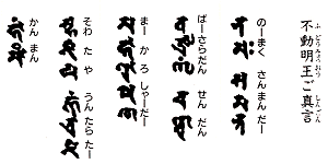 「激しい大いなる怒りの相(すがた)を示される不動明王よ。迷いを打ち砕きたまえ。障りを除きたまえ。所願を成就せしめたまえ。カン